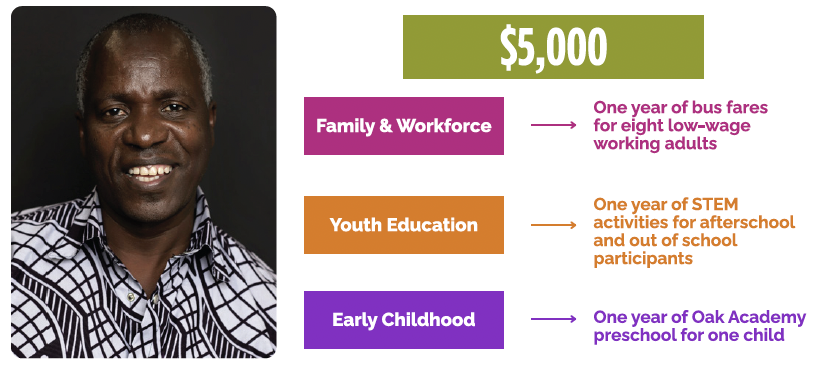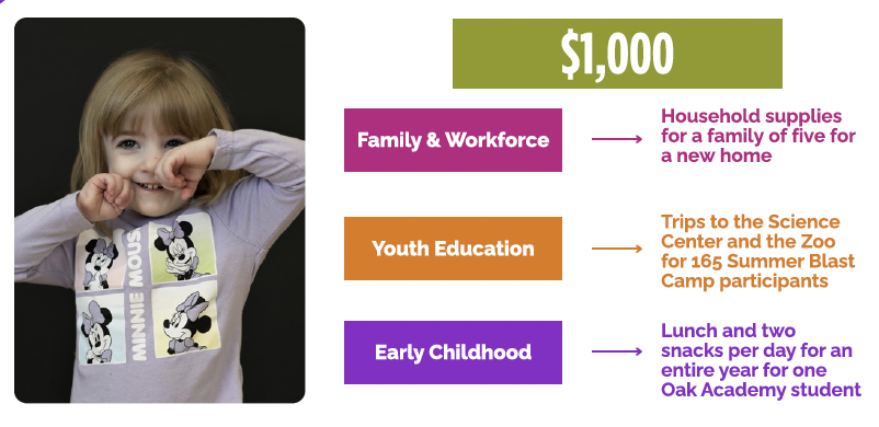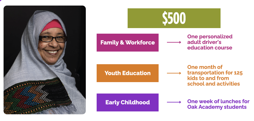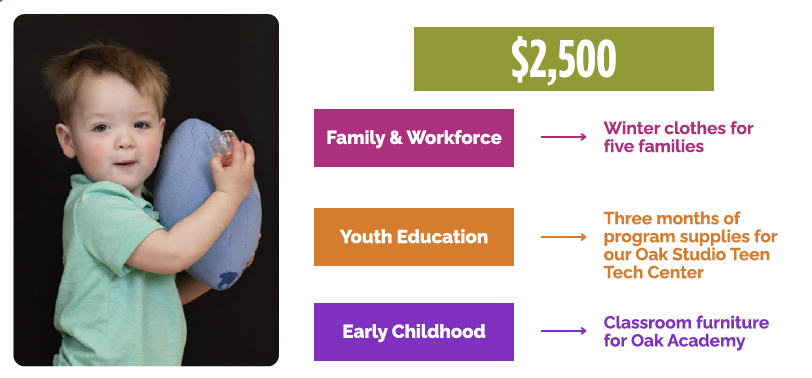 By giving today, you are ensuring that Oakridge Neighborhood remains a community where everyone has the opportunity to thrive. Whether it’s $500 for two weeks of childcare or $2,000 to adopt a classroom, your generosity will directly transform lives. See details below.